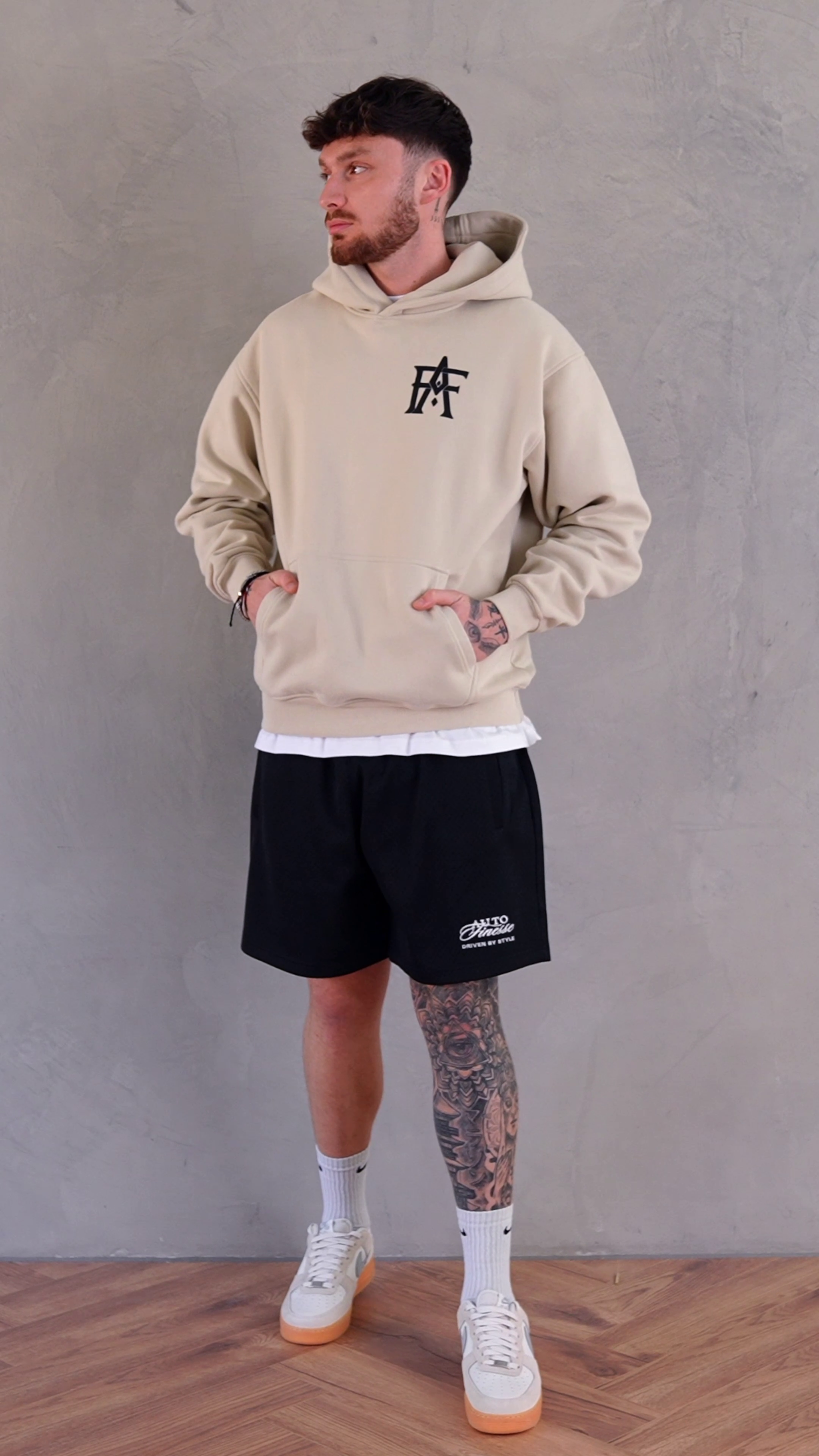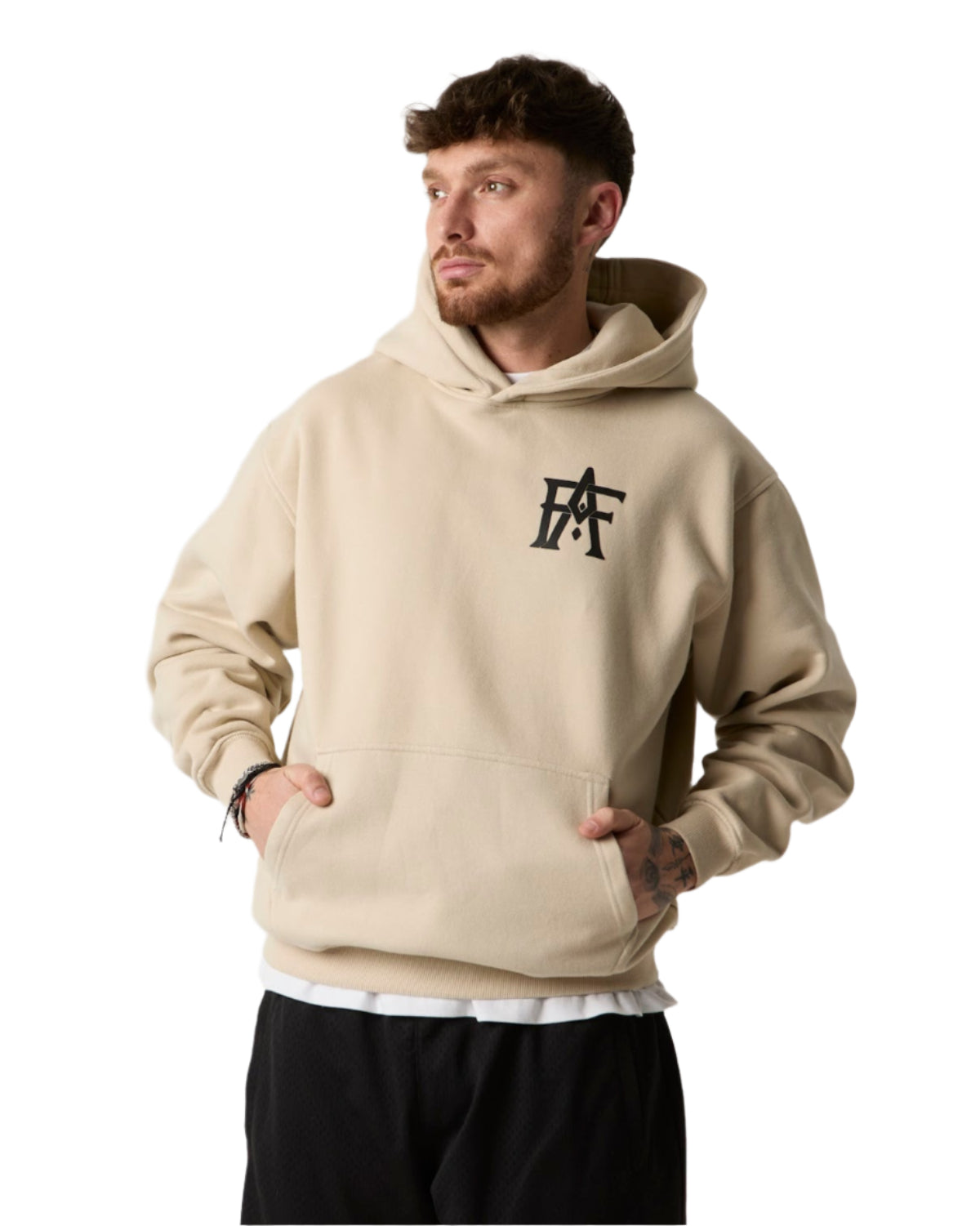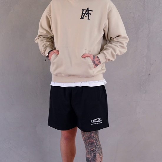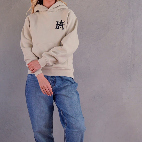 The Monogram Hoodie lands in clean off-white with a raised puff print monogram hit on the left chest. Cut big, dropped shoulders, thick but soft. Built for chill days and cool nights, from workshop floors to car park kings.